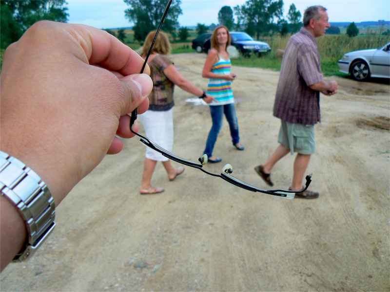 Tuż za zabudowaniami Grodziska leżało w poprzek rzeki zwalone drzewo. Nie tarasowało jej całkowicie, pozostał prześwit idealny dla łódki. Ale rodzicom nie udało się weń wcelować. Silny prąd "przykleił" ich do pnia. Moje nauki znów poszły w las. Dominika skwitowała to potem tekstem, że wyprawa powinna nosić tytuł "O dwóch takich co się gałęzi czepiali".