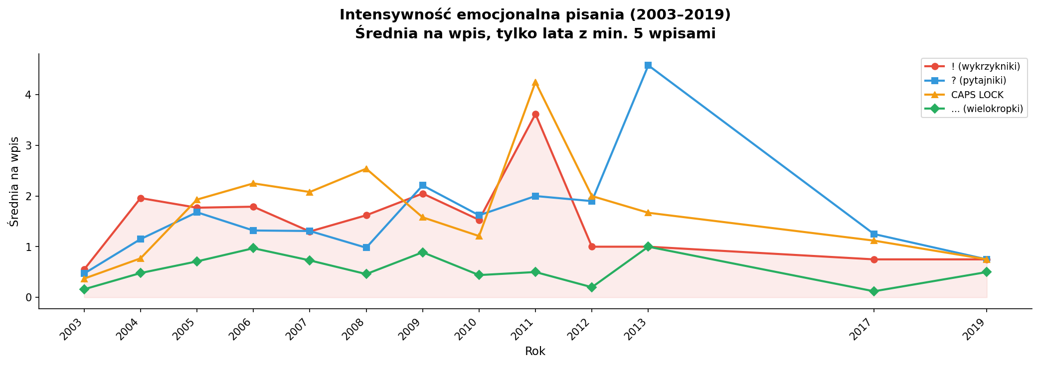 Analiza znaków interpunkcyjnych jako proxy emocji: wykrzykniki (!), pytajniki (?), CAPS LOCK i wielokropki (...). Rok 2008 to szczyt CAPS LOCKA (2.54 słowa/wpis pisane wielkimi literami). Wykrzykniki osiągnęły maksimum ok. 2004 i 2009. Po 2010 widać wyraźne wyciszenie — mniej krzyku, mniej pytań.