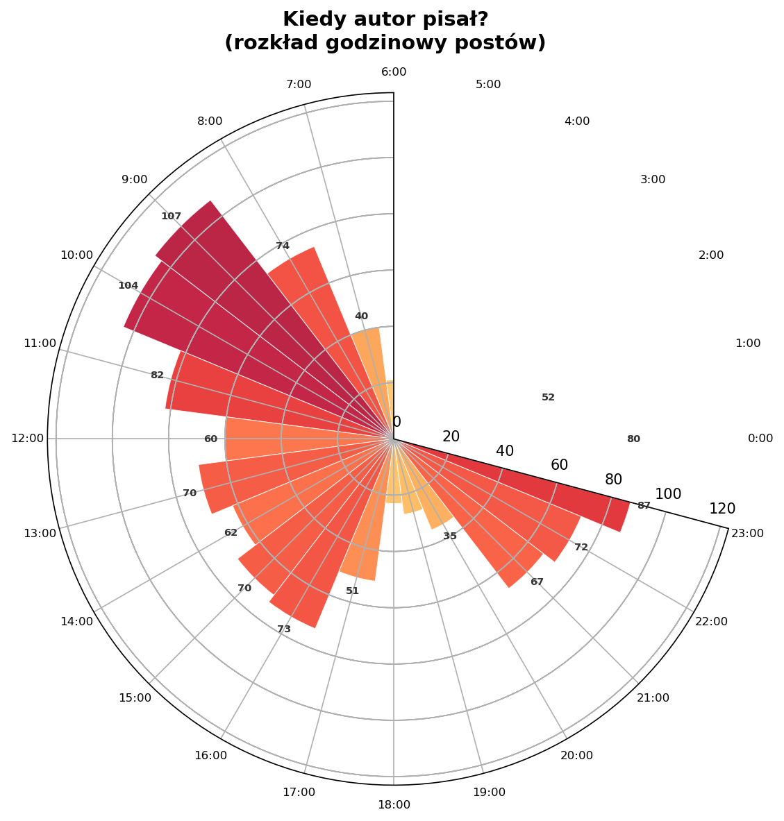 Zegarowy rozkład godzin publikacji ujawnia dwa szczyty: poranno-biurowy (9:00–11:00, łącznie 293 wpisy) i nocny (23:00–1:00, łącznie 219 wpisów). Między 2:00 a 5:00 — cisza. Wygląda na to, że blog powstawał albo zamiast pracy, albo zamiast snu.