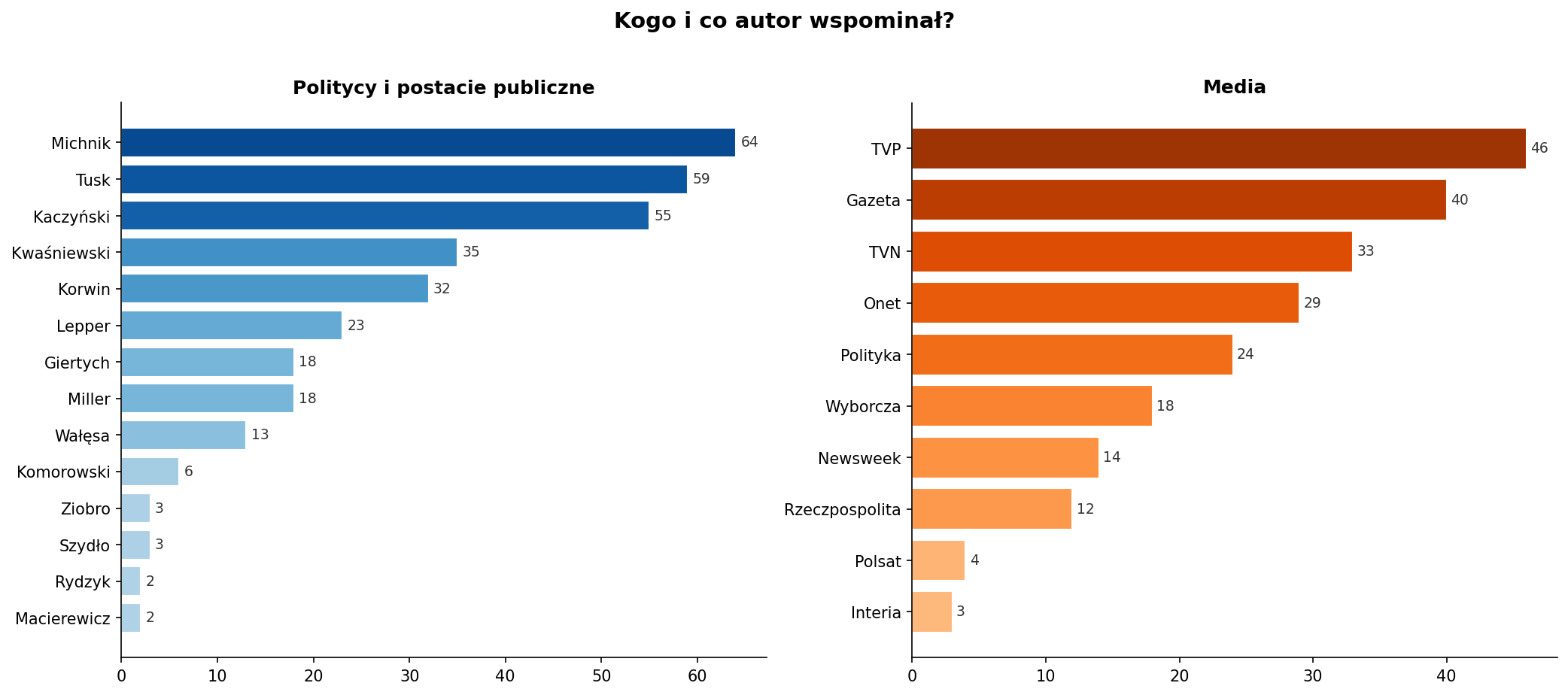 W polityce trójka liderów: Michnik (64×), Tusk (59×), Kaczyński (55×). Michnik pojawiał się raczej jako obiekt krytyki niż podziwu. Korwin (32×) i Lepper (23×) dopełniają obraz kogoś, kto obserwował polską scenę polityczną z rosnącym rozczarowaniem. Z mediów: TVP (46×), Gazeta (40×), TVN (33×).