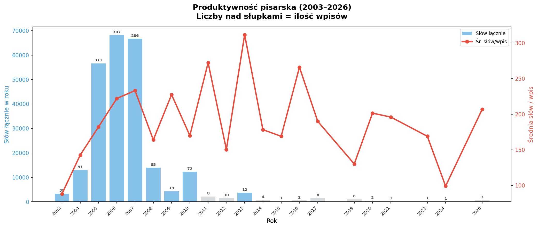 Autor pisał najwięcej w latach 2005–2007 (ponad 300 wpisów rocznie, 56–68 tys. słów). Po 2008 roku nastąpił gwałtowny spadek, a od 2011 blog stał się sporadyczny. Ciekawe, że średnia długość wpisu rosła — autor pisał rzadziej, ale dłużej.