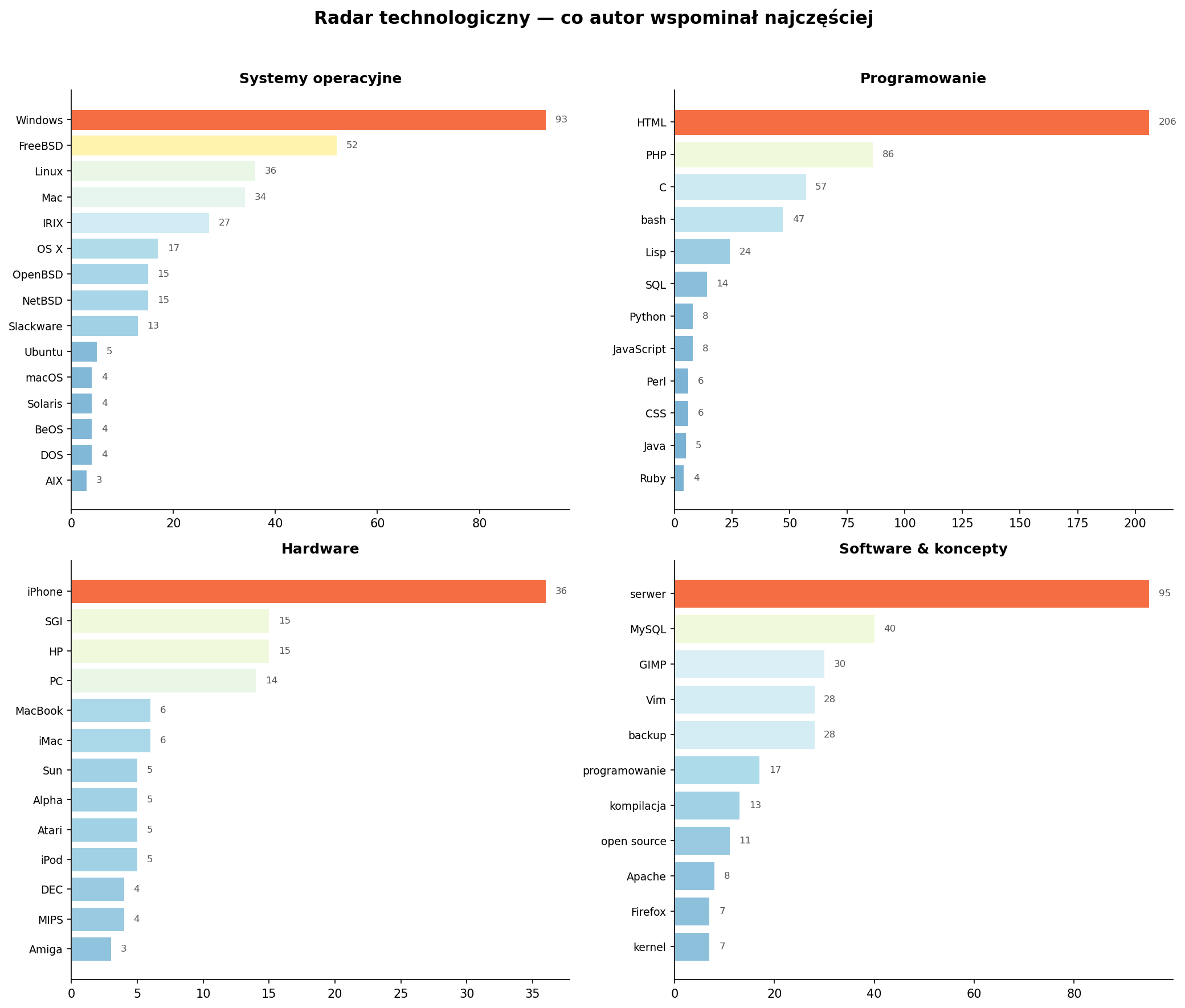 Portret sysadmina starej szkoły: Windows (93×) jako wieczne źródło frustracji, FreeBSD (52×) jako ulubiony system, Linux (36×) i IRIX (27×) jako towarzysze podróży. W programowaniu: HTML (206×) i PHP (86×) na co dzień, C (57×) i bash (47×) do poważnej roboty, a Lisp (24×) — z miłości.