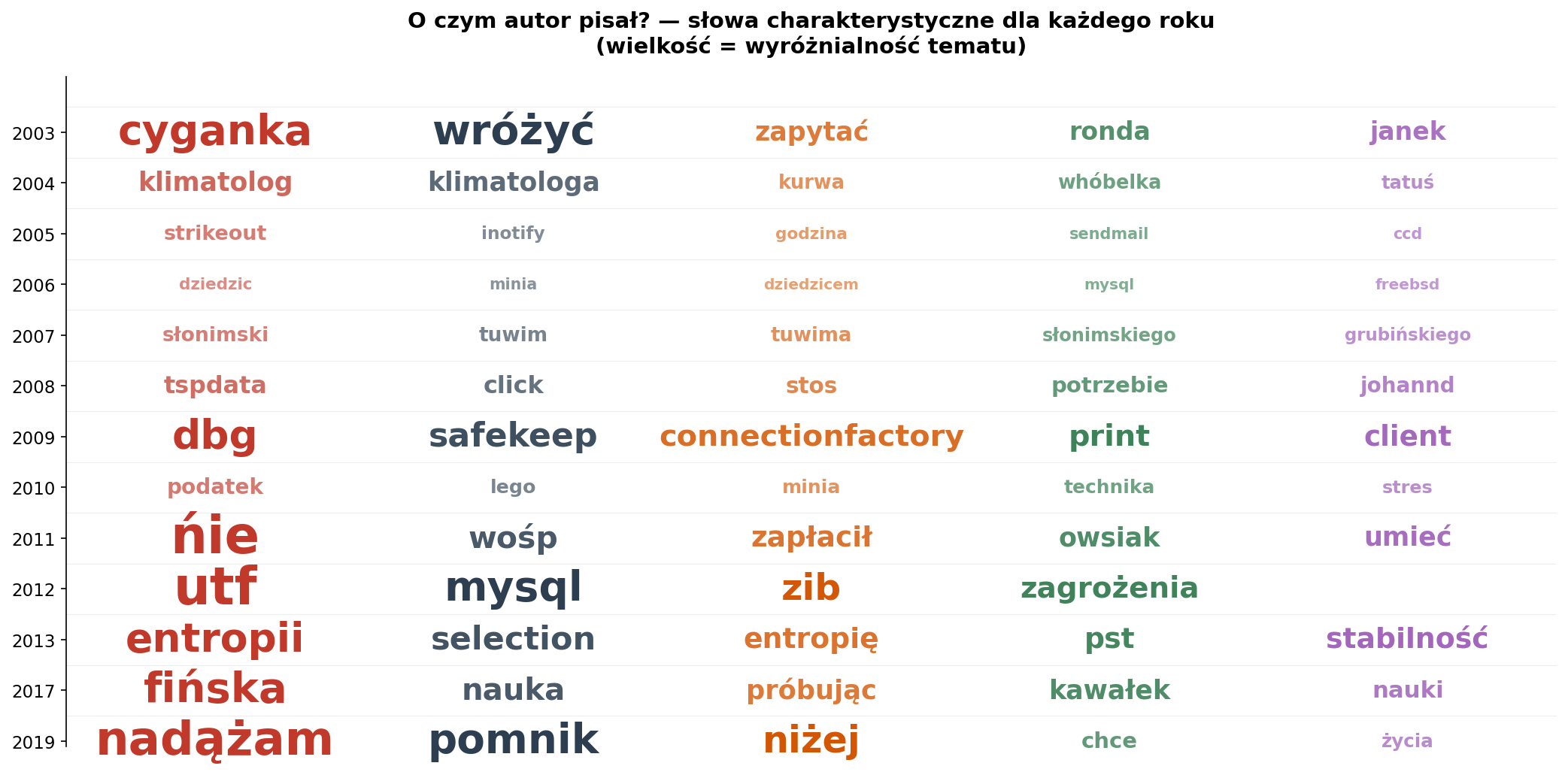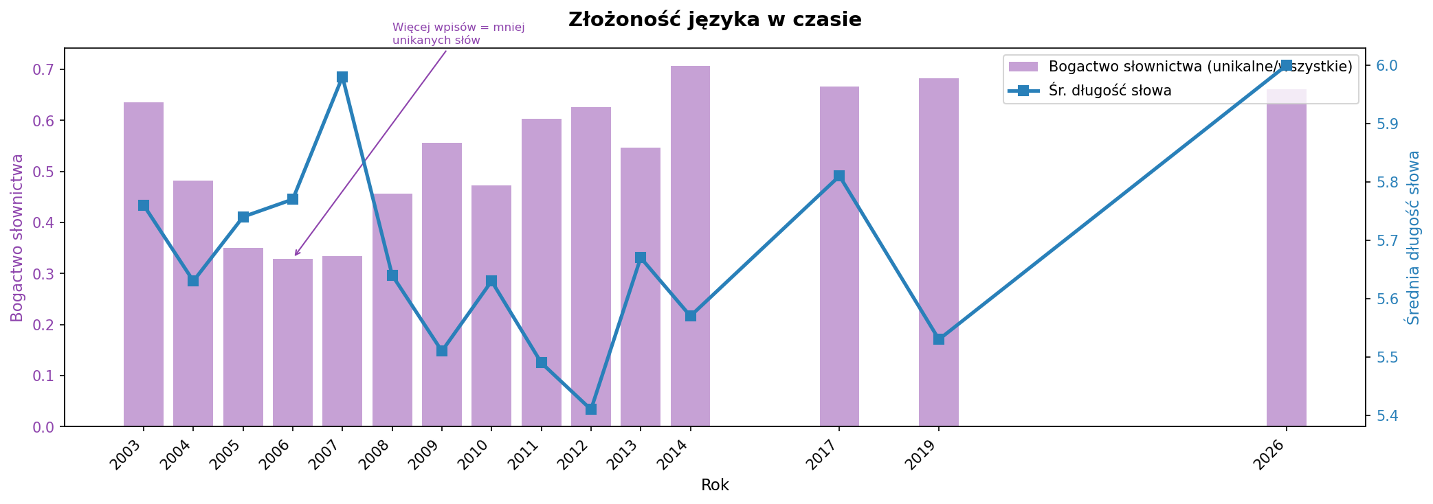 Bogactwo słownictwa (stosunek słów unikalnych do wszystkich) jest naturalnie niższe w latach z dużą liczbą wpisów — trudno być oryginalnym pisząc 300 tekstów rocznie. Średnia długość słowa (~5.6 znaków) jest stabilna, co sugeruje konsekwentny styl pisania.