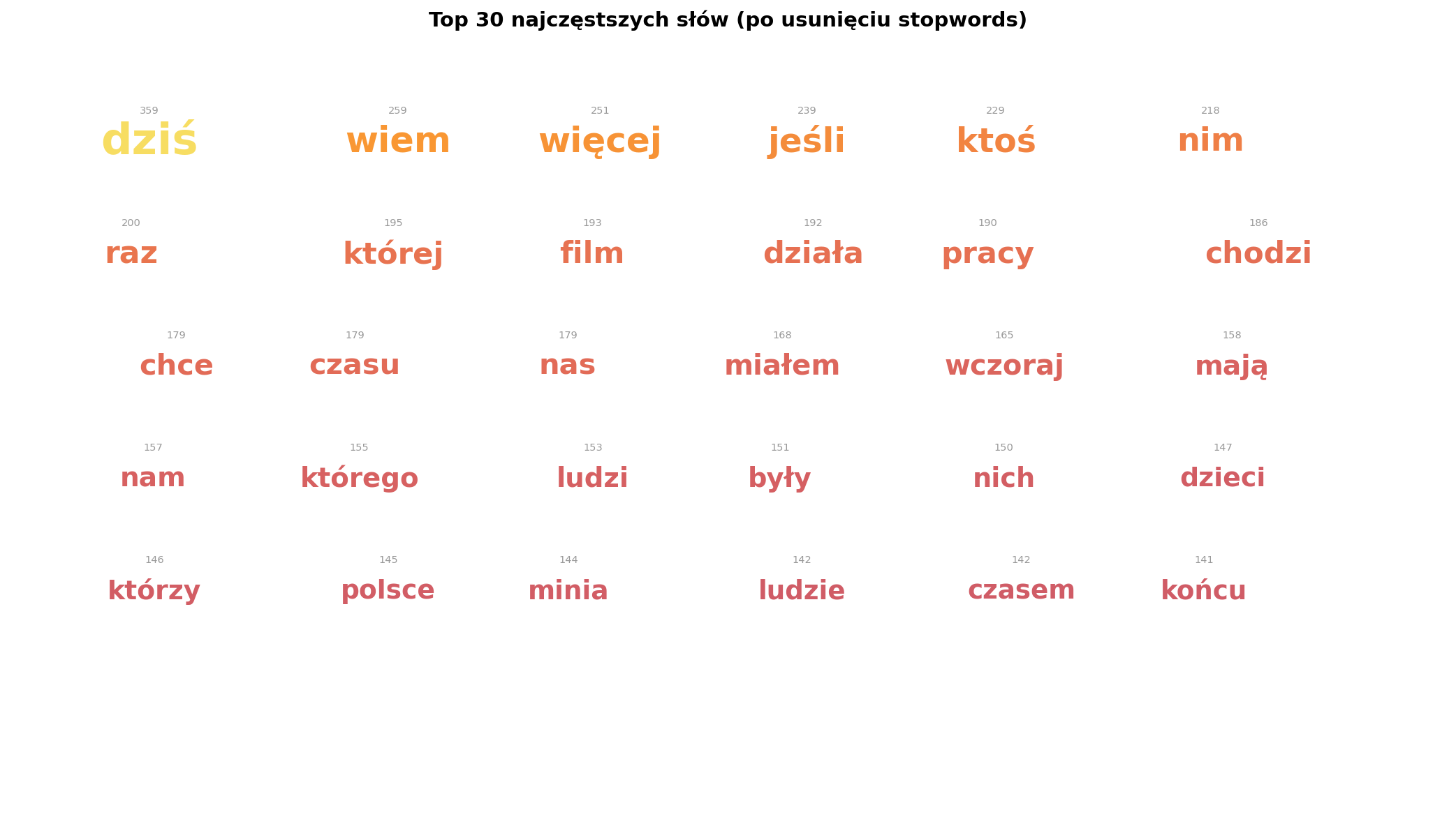 | Najczęstsze słowo (nie-stop) | „dziś" (359×) |